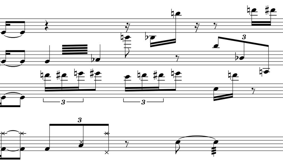 As a brief aside, I do want to give some much deserved respect, and also take some time for self-reflection. The image at the top of this article is an excerpt of a score of my own. Much of the music I have made in the past involved a lot of challenging rhythms, time signatures changing each bar, and even, in the piece “Droll Noon” on my album One Eye with a Microscope Attached, so-called irrational time signatures (i.e. non-dyadic time signatures). There are people who are much more capable of playing and improvising over complex rhythms than I am, and I have a ton of respect for them. These are people who have dedicated their lives to playing their instruments, and have done something that really couldn’t be dreamed of 35 years ago. These super-musicians can not only play written music involving such insane rhythmic complexity, but can also improvise really creatively and with feeling over these extremely challenging forms. While doing that, many of them have assimilated other aesthetics I am partial to, like noise, spectralism, microtonality, good melodic and contrapuntal development, improvisation, etc.
